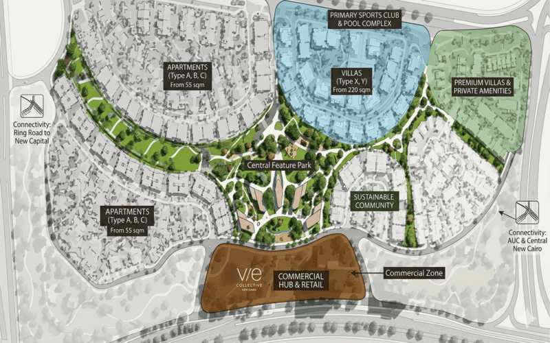 الاسم نفسه — “Collective” — اختارته الشركة عمداً، لأن الفكرة الأساسية للمشروع إنه “مجموعة” مش مجرد كمبوند. مجموعة من الناس بتتشارك نفس أسلوب الحياة ونفس الاهتمام بالجودة، في مكان صُمم ليكون بيئة متكاملة ومش بس مجموعة مباني.